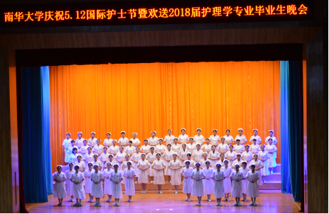 2018年5月12日晚,南华大学庆祝5.12国际护士节暨欢送2018届护理学专业毕业生晚会在学校学术报告厅隆重举行。南华大学副校长何旭娟,学生工作部副部长廖迎春,团委副书记李海洋,松木乡卫生院院长宁勇,南华大学附属第一医院护理部主任欧玉兰,南华大学附属第二医院护理部主任谭玲玲,南华大学附属南华医院护理部主任胡小萍,黄茶岭社区卫生服务中心主任刘德照,护理学院院长廖力、党委书记周浩、党委副书记彭建南和副院长曾谷清出席晚会。护理学院全体师生参加本次晚会。