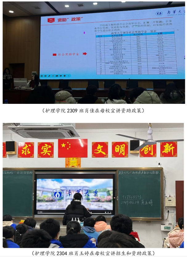 我院学生立足当地学校,对母校进行回访,调查了解高中母校家庭经济困难的学弟学妹、本村或邻近村贫困家庭对国家资助政策的了解程度,并向其宣传和解读国家助学政策。同时以ppt的形式向学弟学妹们详细地介绍了国家以及我校的资助政策,让更多的学生、家长更加全面地了解学生资助政策,使国家学生资助政策深入每个学生家庭,感受到国家和党的深切关切。同时也结合个人的大学生活感受,面向高中母校学生,分享南华大学丰富的学习与生活,为有意向报考南华大学的学弟学妹提供学业指导及报考指导,耐心地为他们答疑解惑,树立高考的远大志向。