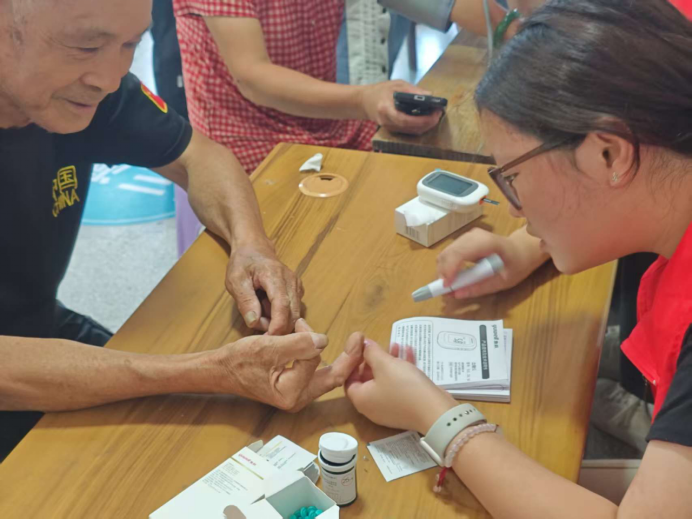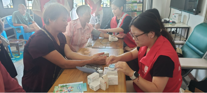 (图为志愿者为村民测血压、血糖)