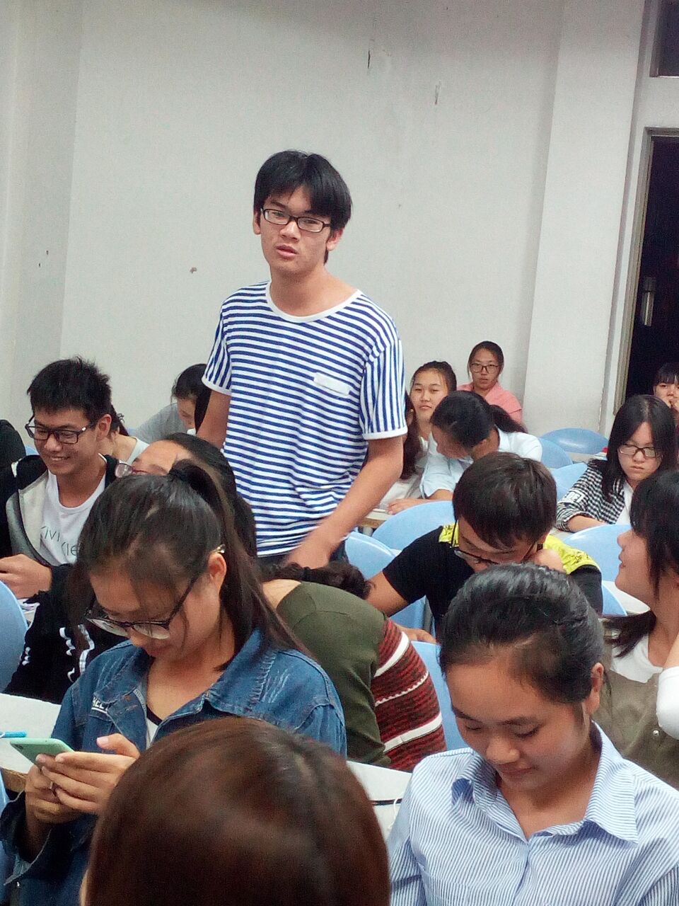活动由两部分组成,第一部分为老生经验分享。来自156班的覃蕾表示自己大一时也曾迷惘,曾因参加了学校学院很多活动,使学习一度中断,直到英语四级和期末考来临时才意识到自己上大学的初心,并用自己的亲身经历向学弟学妹们介绍了她是如何调整自身状态,实现综合能力全面发展的。而来自156班的宋红程则向大家分享了自己从大一到大二的心态变化历程。从起初对学校和专业的不认同到最后喜欢上这样这个专业,这不仅仅是自身的一段成长历程,更教会了他如何去适应环境,去改变环境。对于学习,他强调课堂效率的重要性,同时也劝诫学弟学妹去珍惜大学每一段时光,学习中不忘享受生活的点点滴滴。来自15级的心协骨干张彤和陈锡琳也依次上台与大家分享了自己的入学经历与体会。