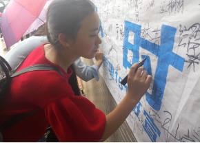 同学们撑着伞在横幅上签名。(曹叶琴摄)