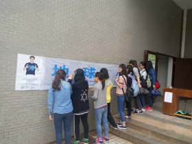 活动当天中午,志愿者们早早的搬来桌椅,在新食堂门口进行摆点宣传。他们在墙上贴上和绿色生活协会共同制作的精美横幅,欢迎过往同学前来签名响应“地球一小时”活动。正值大雨,横幅大部分在雨中,一些感兴趣的同学听了志愿者的讲解,不由分说拿起笔冒雨去签了名。短短一个小时,就有60个人在横幅上签名,还有几位路过的老师也加入了签名的行列。