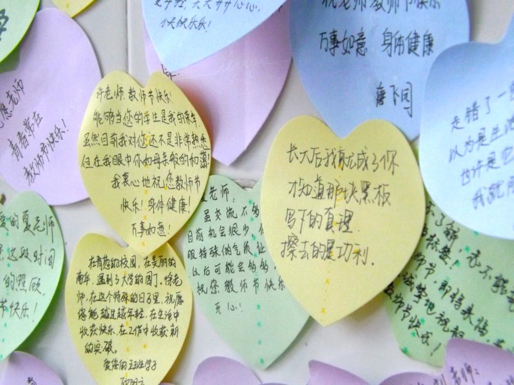 “开学以来,学院老师一直十分关心我们,帮助我们解决生活、学习等方面的各种问题,尽快适应大学生活,所以大家都想在教师节表达一下我们的感恩之情”,来自165班的姜媛握着手中的便利贴激动地说。