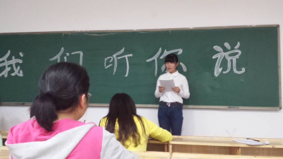 4月中旬,为响应安徽卫视《超级演说家》节目主旨,充分挖掘当代大学生内心深处的真情实感,以故事感动他人,靠行动影响行为,从而创建新时代背景下的大学生核心价值观,为青年提供正能量的思想导航。由共青团南华大学委员会主办、南华大学青年志愿者指导中心承办的“我们听你说”第二届大学生演讲大赛初选在各院拉开序幕。4月17日晚、19日晚护理学院“我们听你说”演讲比赛初选分别于雨母校区逸夫楼506及红湘校区一教108进行。院青志队的张莎等人及大二各班班长分别担任选拔赛的评委。