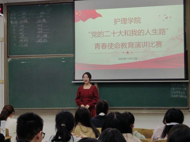 为号召全体同学深入学习贯彻党的二十大精神,弘扬伟大建党精神,厚植爱党爱国爱民情怀,筑牢信仰之基,展开追梦之翅,砥砺奋斗意志,11月13日晚上,护理学院团委和学生会在南华楼103教室举办“党的二十大和我的人生路”青春使命教育演讲比赛。院团委书记肖璐璐、副书记李抒蔓、学社联主席彭澳、宣传部部长曾燕出席比赛,2021级和2022级同学到现场观看了比赛。本次演讲比赛由护理2204班李奥主持。