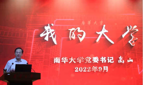 9月14日下午,南华大学党委书记高山以“我的大学”为题,在南华大礼堂为2022级全体本科新生上“开学第一课”。护理学院315名新生在学院党委书记袁春阳和副书记王祥的带领下通过线上线下方式参加了听课。